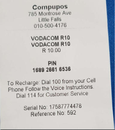 Data Bundles, Unipin Electricity, Lotto, Sportbetting, TopTV now available!Payments made by EFT from FNB will be credited to your account automatically and immediately if your correct cell number is entered as the reference number. There is no need to email / Text proof of payment. Payments from a different bank take longer.If your airtime balance is not updated or you do not receive a confirmation email… please email us your registered cell number & amount paid on support@4pos.co.za to check.Cash deposits do have an additional fee. We have negotiated the best possible cash deposit fee!You will be notified via an email of your new updated balance. 4. Now, you are ready to sell! From your 4POS Point of sale, either scan the Airtime item eg. V0002 (Vodacom R2.00) or search for it on your 4POS system. 5. You may sell other products or even more airtime. Finalise the sale when ready.6. 4POS will print your normal receipt when prompted as well as the Airtime voucher once complete.