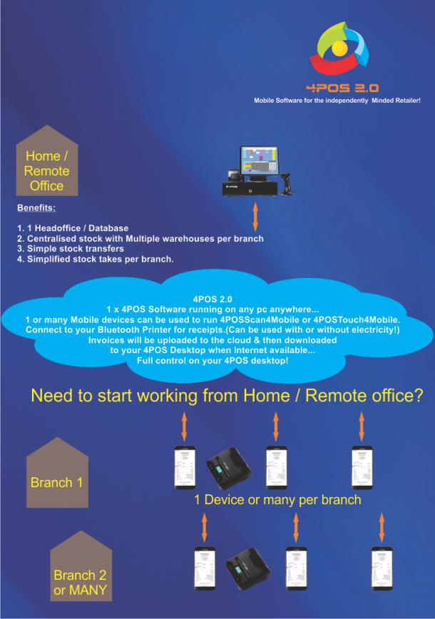 The process in Words :1.Install & create your items in your 4POS Desktop version.2. Upload your data to the cloud3. Install the 4POSScan App4. Enter your 4POS Voucher number5. Your pricing will be automatically downloaded6. Start selling7. Finalise the sale to Cash / Card / EFT / Account8. Print the receipt to your 4POS BlueTooth Printer.9. Sales will automatically be uploaded to the cloud as you go.10. Whenever you want, download sales to your 4POS Desktop.- Now check stock, sales & turnovers :- Dayend Totals- Itemised Sales- Itemised Stock Holding- Inter Branch Transfers